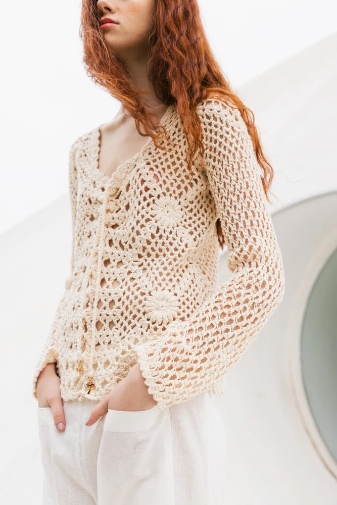 Blusa manga longa com modelagem rente ao corpo, abertura frontal e amarração. Confeccionada em crochê feito à mão, com ponto leve, vazado em formato de tela e flores.