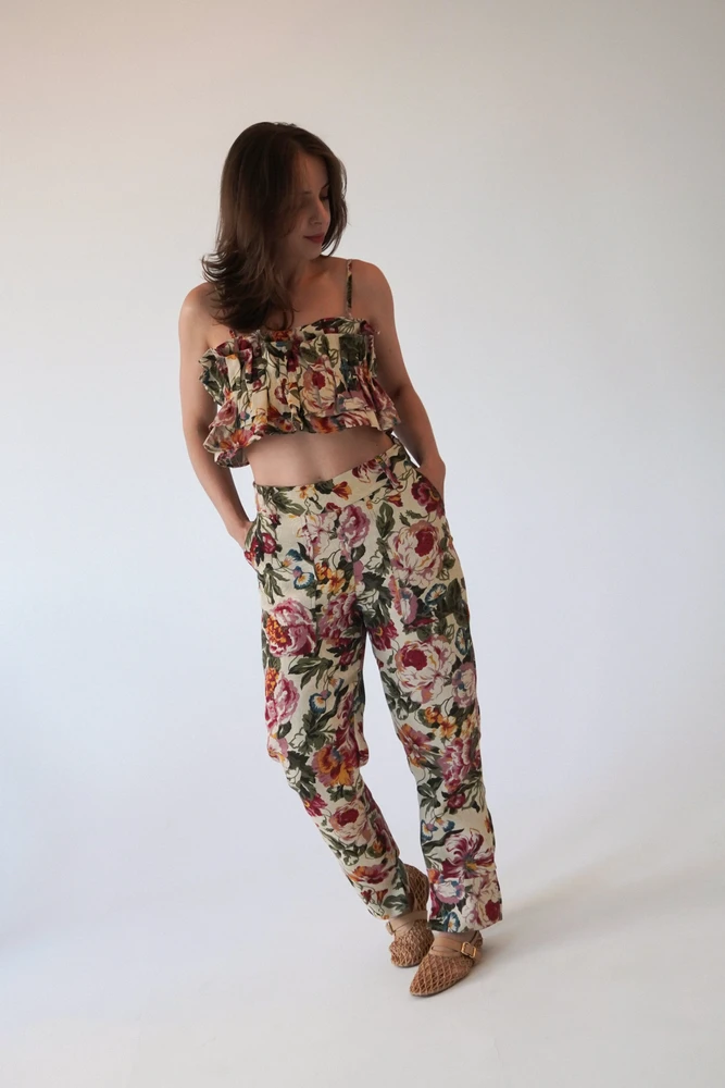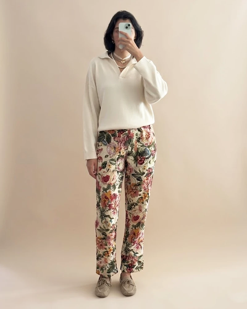 Acredito que uma peça estampada já faz o trabalho para trazer mais personalidade para o nosso armário. A calça jacquard floral entrou na curadoria justamente por isso. Podemos combiná-la com camisas, camisetas ou até fazer um mix de estampas perfeito.
