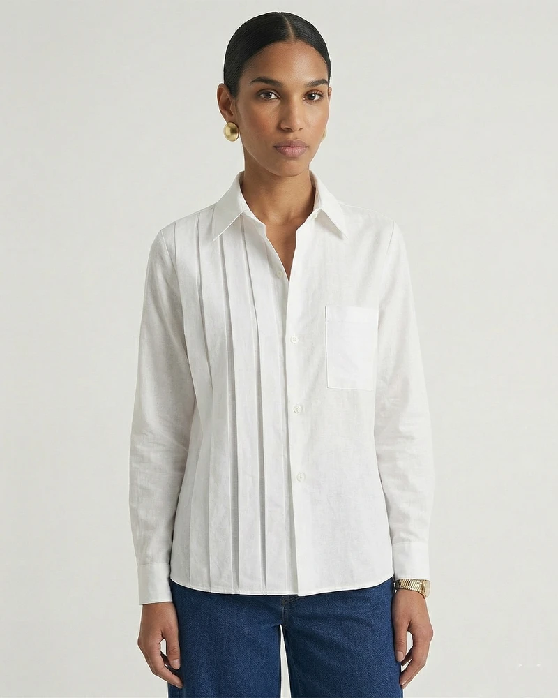 Descrição: Camisa clássica de gola com colarinho feita à mão em cambraia de algodão com linho, metade da estrutura da camisa é construída com pregas, trazendo um assimetria e textura à peça. Um toque moderno para fugir da clássica camisa branca e lisa :) Possui manga comprida com punho, bolso dianteiro lateral, pala dupla nas costas e abertura frontal em botões.