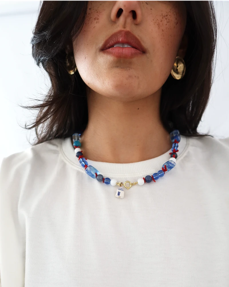 feito com miçangas e cerâmica pintada a mão, o colar cerâmica azul traz personalidade pro look.