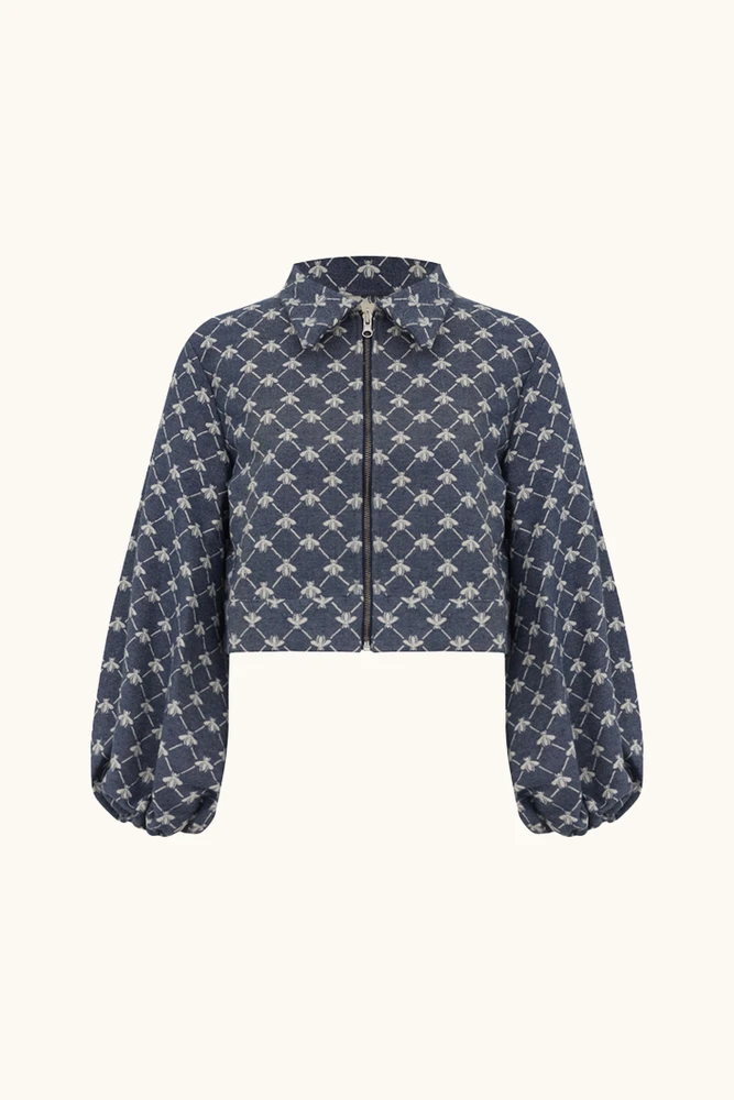A costura e acabamento interno permitem que seja utilizada como dupla face. Estampa figurativa de abelhas em tom contrastante. Possui comprimento curto, mangas longas bufantes com elástico nos punhos, colarinho alongado, fechamento frontal por zíper de metal destacável, podendo ser usada do lado avesso.
