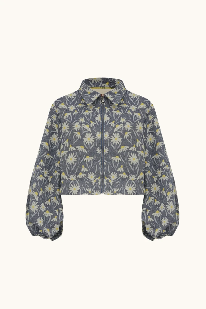 A costura e acabamento interno permitem que seja utilizada como dupla face. Estampa figurativa de margaridas em tom contrastante. Possui comprimento curto, mangas longas bufantes com elástico nos punhos, colarinho alongado, fechamento frontal por zíper de metal destacável, podendo ser usada do lado avesso.