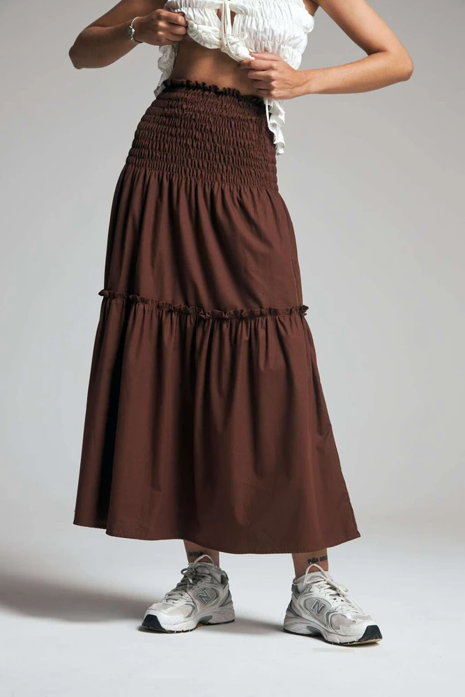 Descrição: Saia longa de babados com cós largo em lastex, possui elástico de reforço na cintura. O babado inferior da saia é sobreposto à peça. Pode ser usado como vestido dependendo da altura da cliente. Peça maravilhosa e cheia de detalhes, muito feminina e versátil. Os tamanhos desse modelo foram reduzidos devido ao lastex presente no cós da saia, possibilitando que a peça se adeque em corpos de tamanhos diferentes.