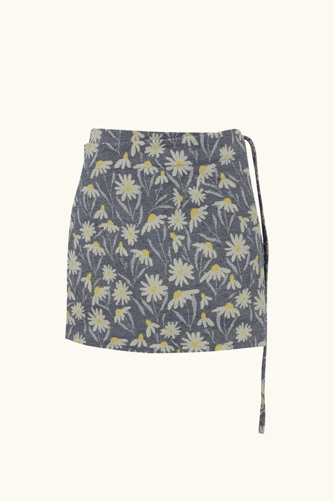 O modelo possui comprimento mini, cintura alta, abertura lateral para o transpasse e faixas aplicadas nas laterais. A costura e acabamento interno permitem o uso dupla face, e a estampa figurativa de abelhas em tom contrastante dá um toque exclusivo e divertido.