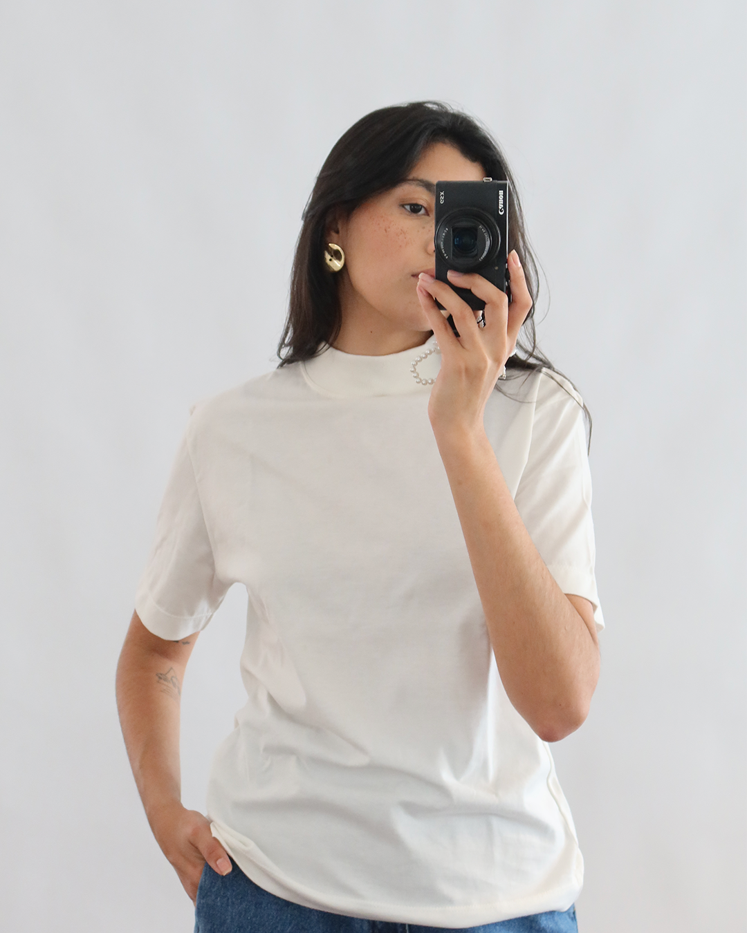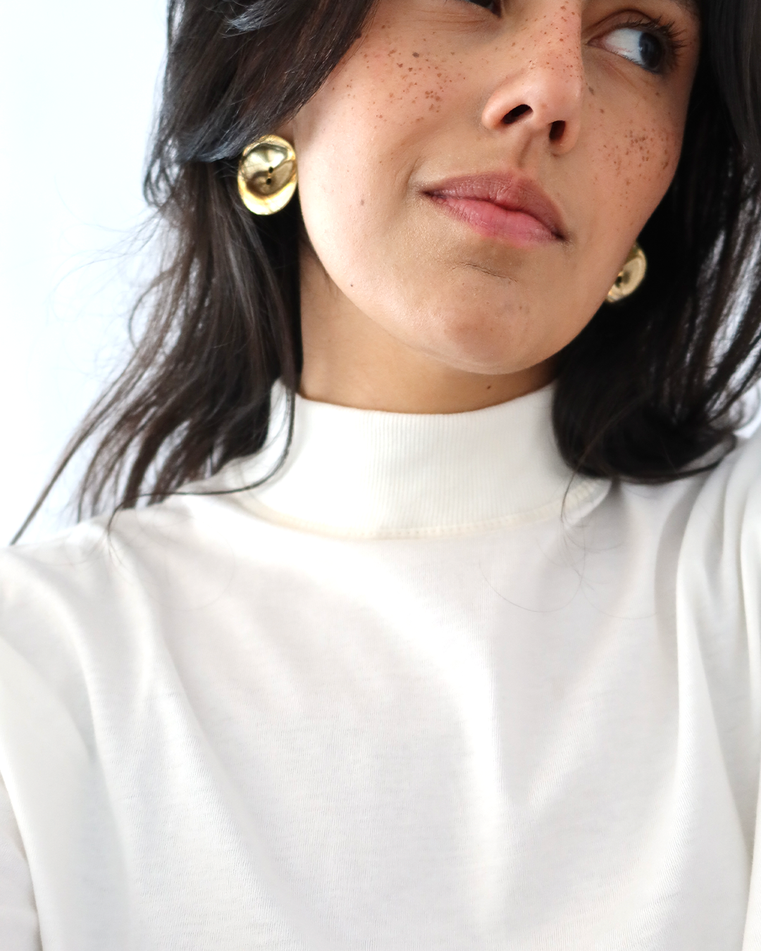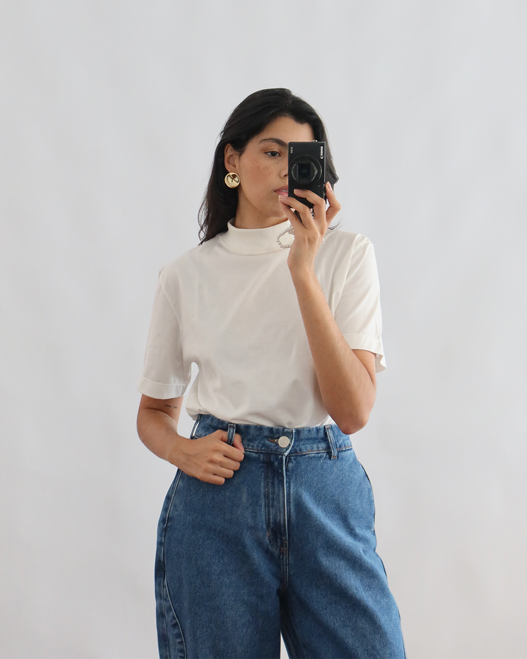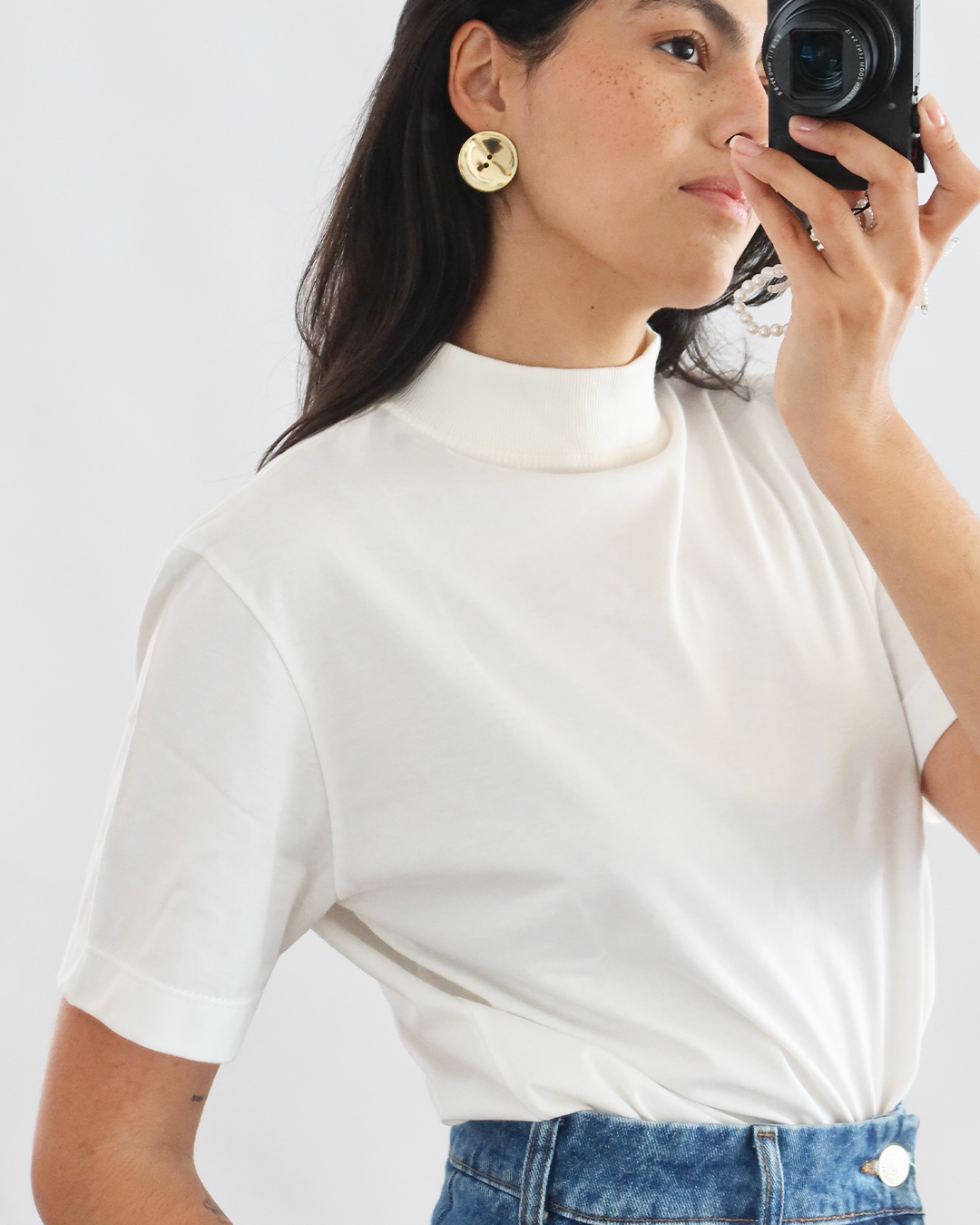 uma camiseta de gola alta, que é um básico com um toque especial (amamos!)