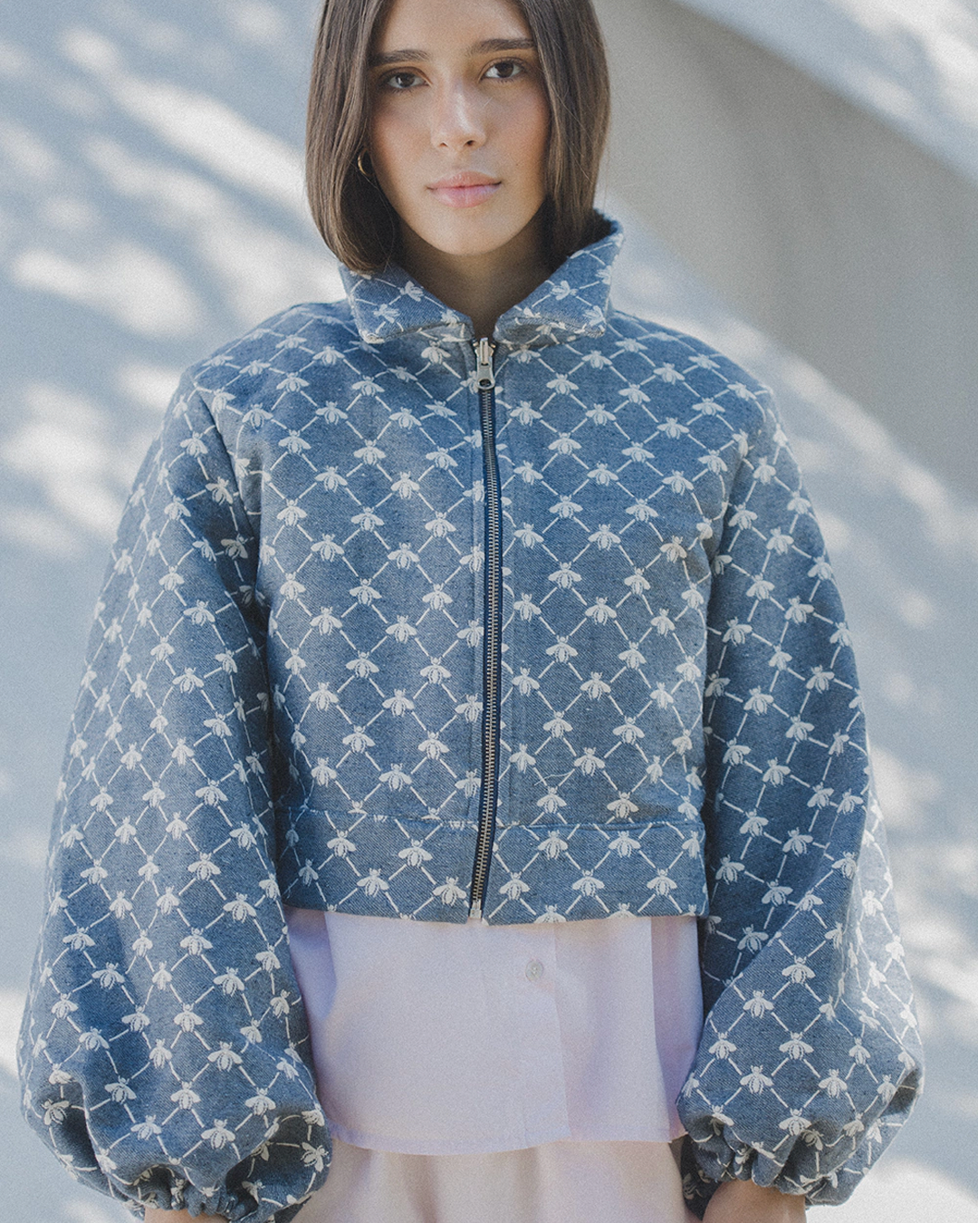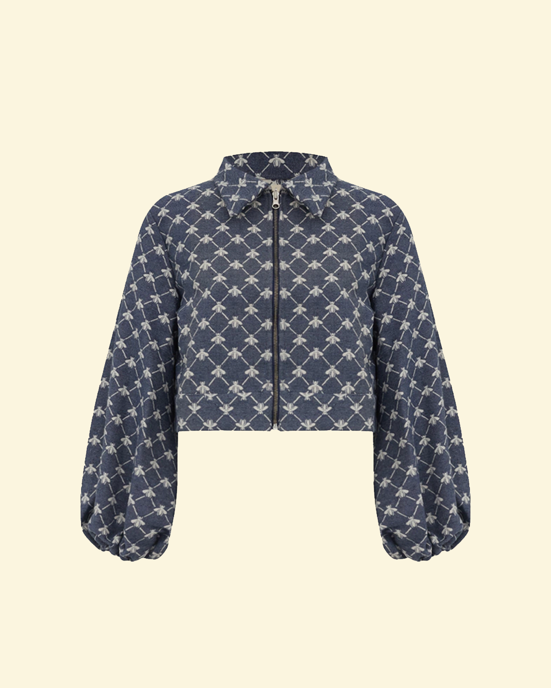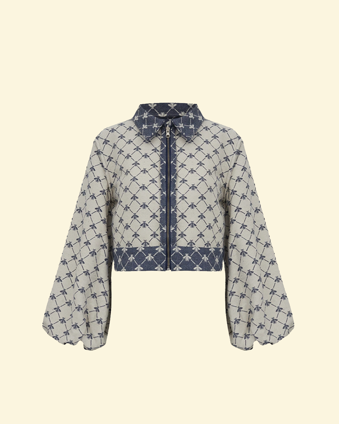 a costura e acabamento interno permitem que seja utilizada como dupla face. estampa figurativa de abelhas em tom contrastante. possui comprimento curto, mangas longas bufantes com elástico nos punhos, colarinho alongado, fechamento frontal por zíper de metal destacável, podendo ser usada do lado avesso.