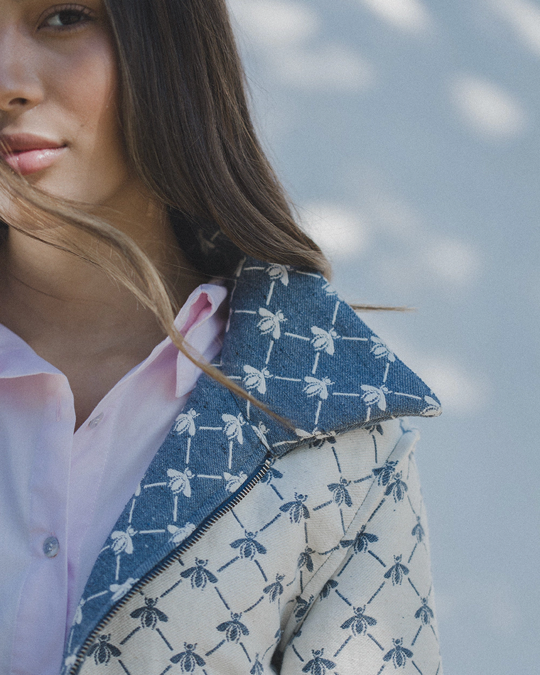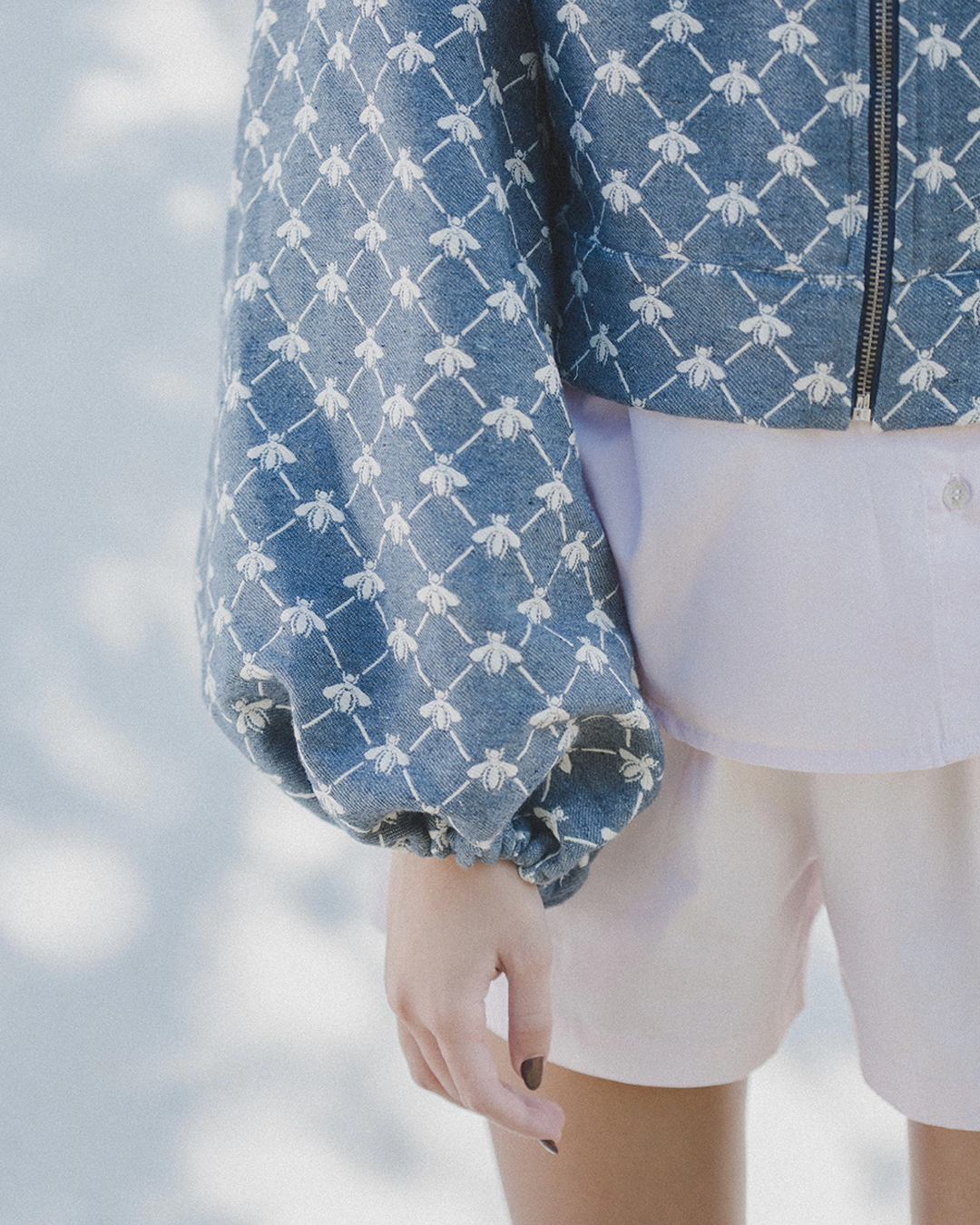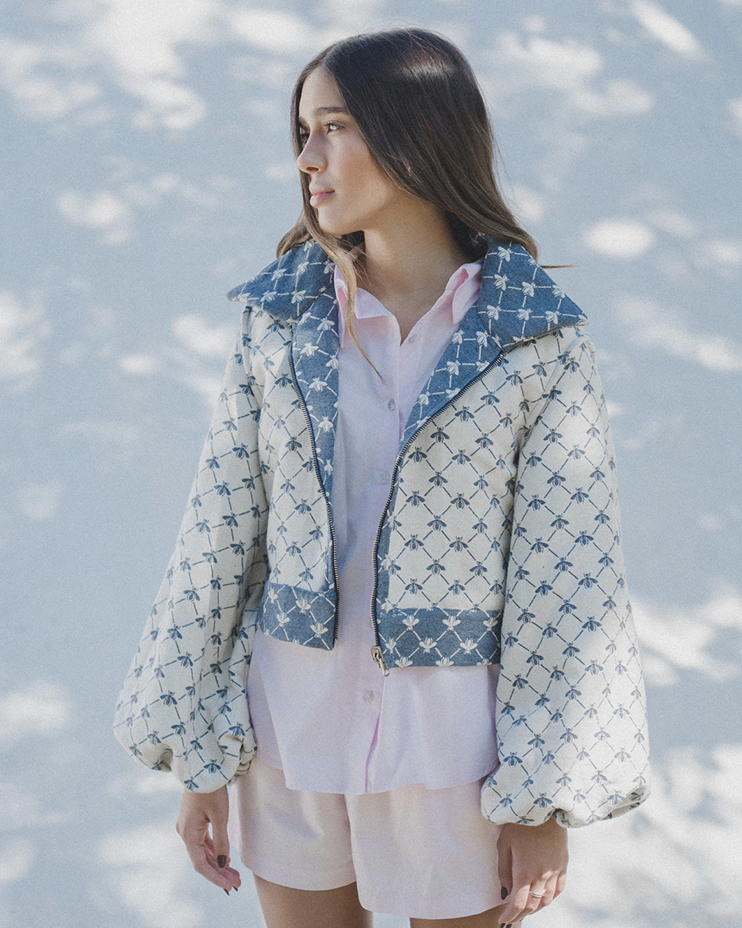 a costura e acabamento interno permitem que seja utilizada como dupla face. estampa figurativa de abelhas em tom contrastante. possui comprimento curto, mangas longas bufantes com elástico nos punhos, colarinho alongado, fechamento frontal por zíper de metal destacável, podendo ser usada do lado avesso.